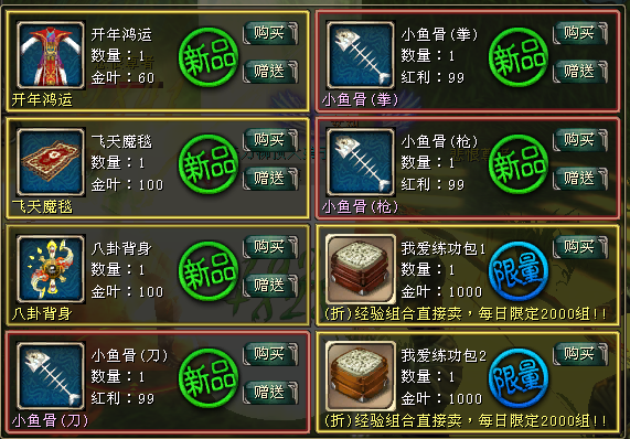抢购规则:我爱练功包1、2每天限购2000个售完即止(每个角色每天限时购买一个)