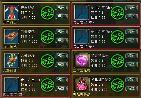 开年鸿运:广播类(开运龙袍,开运喜帽,开运袖带,开运福面)3.6%,强化类(防爆符,神佑符)28%,丹药类(经验修行丹,悠然自若丹)20%,便携类(靡音水,灵坛兑换卡)28.4%